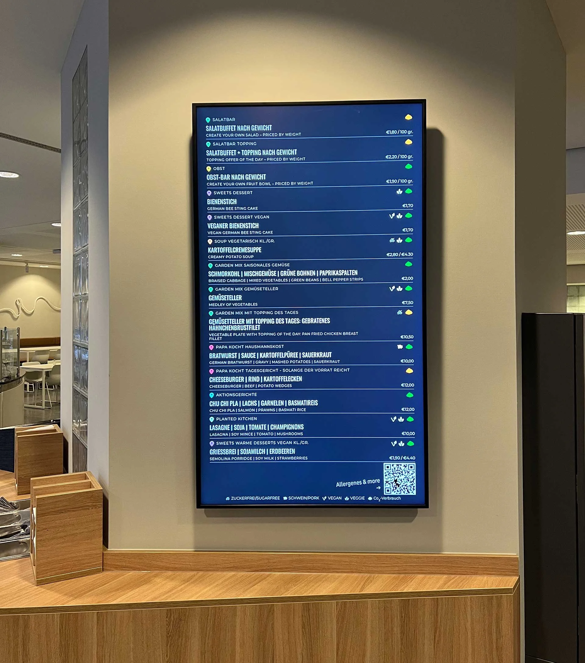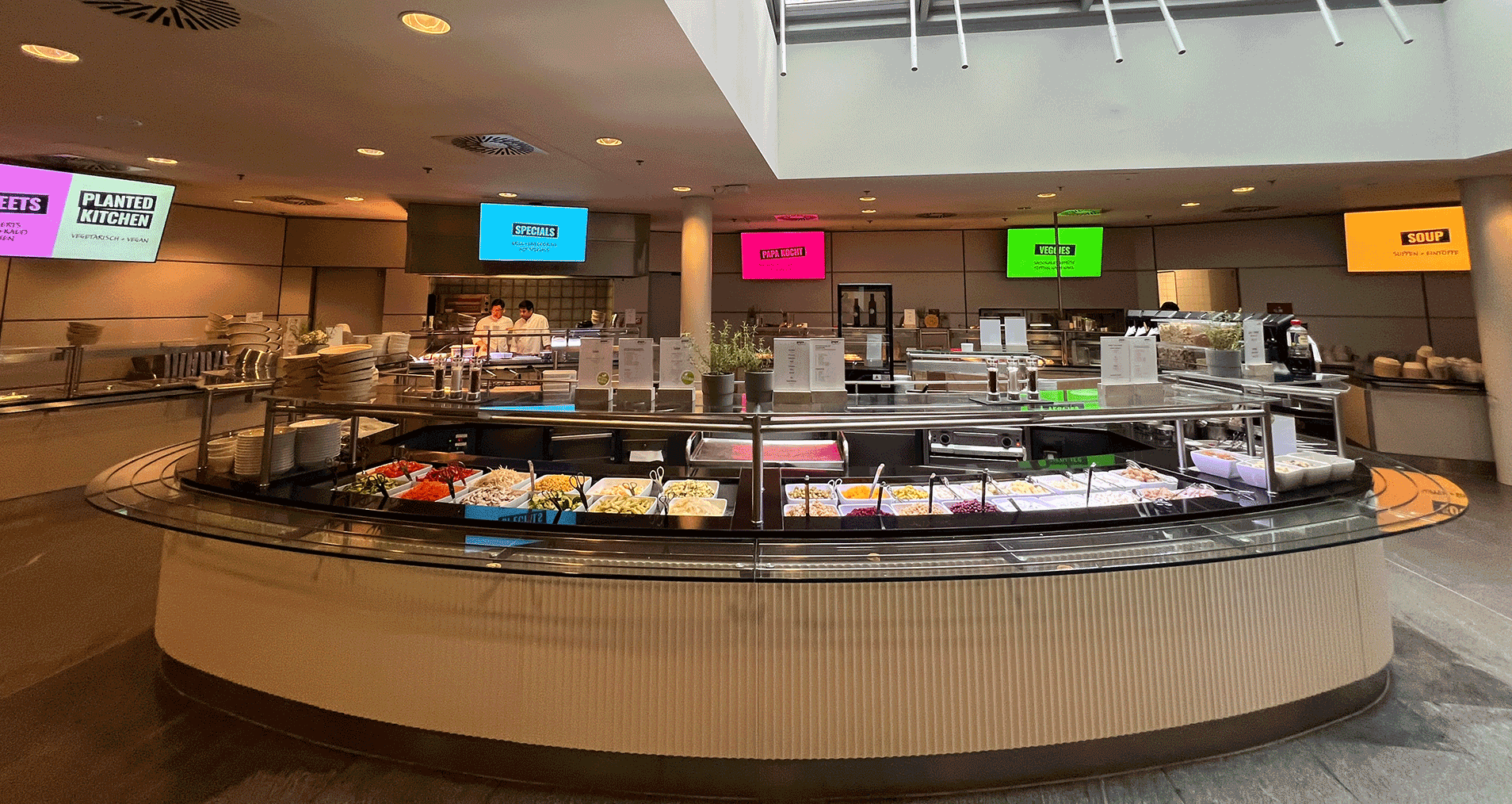 In den verschiedenen Kantinen bei Axel Springer braucht’s Übersicht, wo und überhaupt was es zu Essen gibt. Die Stationen haben nun eine farbliche Indikation zur schnelleren Findung des Lieblingsgerichts.