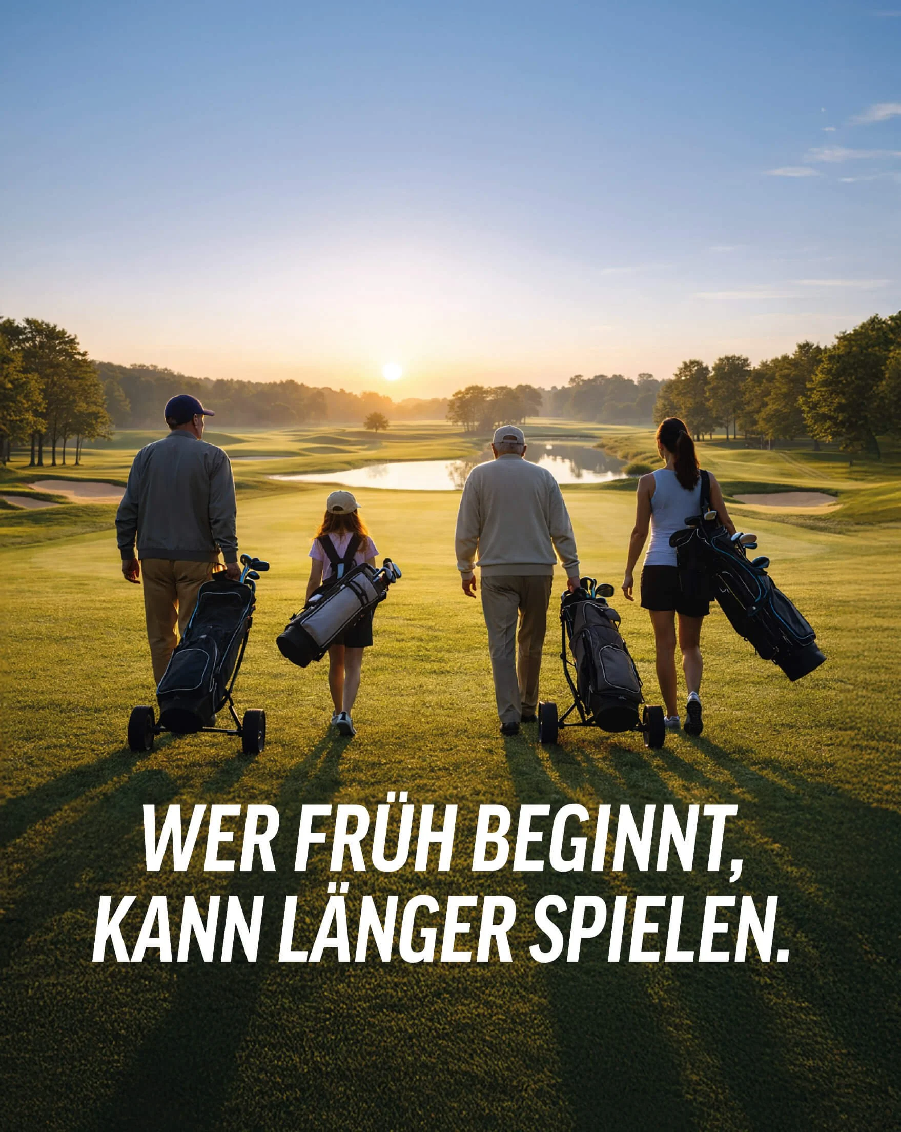 Ein mit KI generiertes Bild zeigt 4 Generationen Golfer, denn Golfs USP ist u.a., dass man es generationenübergreifend spielen kann.